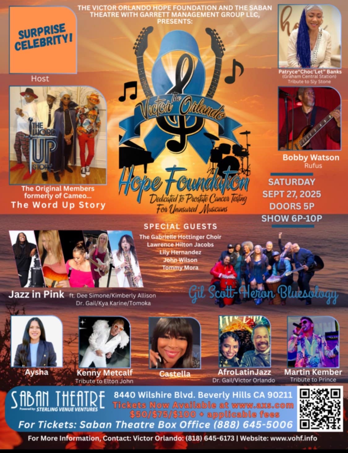 BEVERLY HILLS, CA. – The Victor Orlando Hope Foundation (VOHF) is pleased to announce its Prostate Cancer Awareness Concert to benefit uninsured musicians. The event will take place on Saturday, September 27, 2025 from 6:00 p.m. – 10:00 p.m.(doors open at 5:00 p.m.) at the Saban Theatre in Beverly Hills, California.