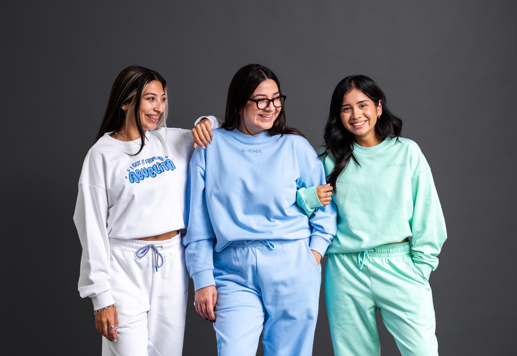 The Legacy Glow Club Sweatsuit pays tribute to the iconic POND’S Cold Cream Cleanser in a rich teal hue that mirrors the classic jar. The I Got It From My Abuelita Sweatsuit, designed in crisp white, honors the beloved POND’S Dry Skin Cream and the self-care traditions passed down from abuelitas to their families. Rounding out the capsule, the Sweats & Skincare? Sí Por Favor Sweatsuit comes in light blue, inspired by the POND’S Fresh Hydration Hyaluronic Acid + Vitamin E & B3 Gel Moisturizer, perfect for those who know hydration is always essential.