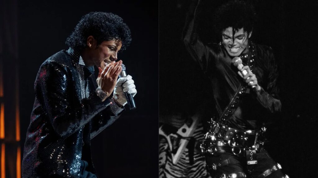 Jaafar Jackson (left) in “Michael,” with the real Michael (right) performing in Japan in 1987. Like his uncle, Jaafar is a singer and dancer.